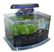 The PicoTope is a beautiful 3 gallon curved glass desktop aquarium--an excellent starter tank. Features include rounded glass corners for panoramic viewing, a beveled glass bottom, a 9 watt 50/50 clamp on lamp and a Pico power filter.